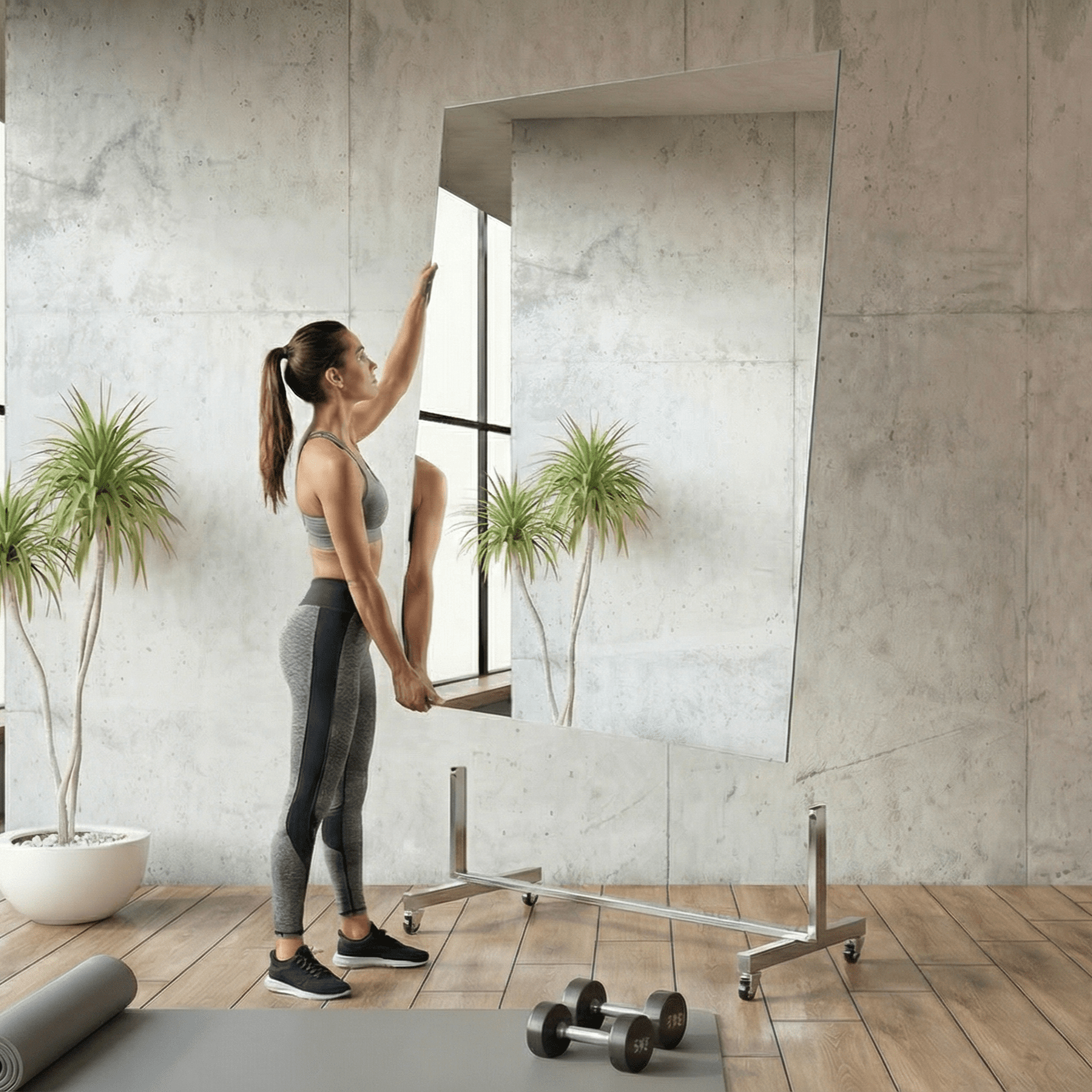 Bruchsicherer Spiegel für Fitness, Yoga und Tanzstudios mit gestochen scharfer Reflexion für präzise Körperhaltungskontrolle.